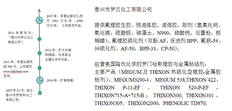 泰州市羅蘭化工有限公司向您提供氟橡膠生膠、預(yù)混煉膠、混煉膠、助劑(氫氧化鈣、氧化鎂、硫酸鋇、硅藻土、N990、硅酸鈣、石墨粉、棕櫚蠟)、氟橡膠硫化劑(雙酚AF、促進(jìn)劑BPP、氟聯(lián)-5#、3#硫化劑、AF-50、BPP-33、CP-50);經(jīng)營美國陶氏化學(xué)的羅門哈斯橡膠與金屬粘結(jié)劑,主要產(chǎn)品(MEGUM及THIXON熱硫化型橡膠-金屬膠粘劑):MEGUM3290-1,MEGUM 538,THIXON 422,THIXON P-11-EF,THIXON 520-P-EF,THIXON715-A+715-B;THIXON300,THIXON301,THIXON305,THIXON2000,PHENOLIC TD870;
